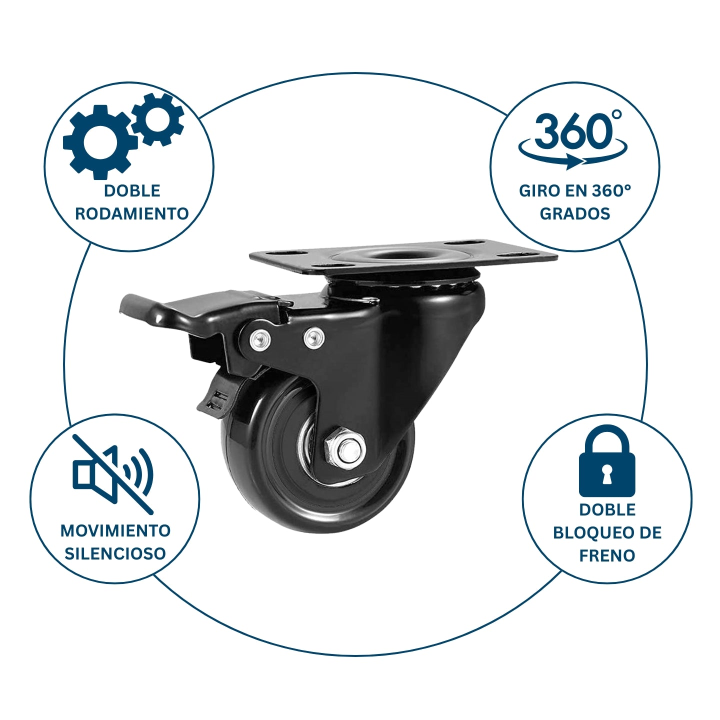 SIRVEN PARA FACILITAR EL MOVIMIENTO DE MUEBLES, ESTANTERÍAS, CARROS Y OTROS ELEMENTOS, OFRECIENDO DESPLAZAMIENTO SUAVE Y CONTROLADO GRACIAS A SU FRENO INCORPORADO