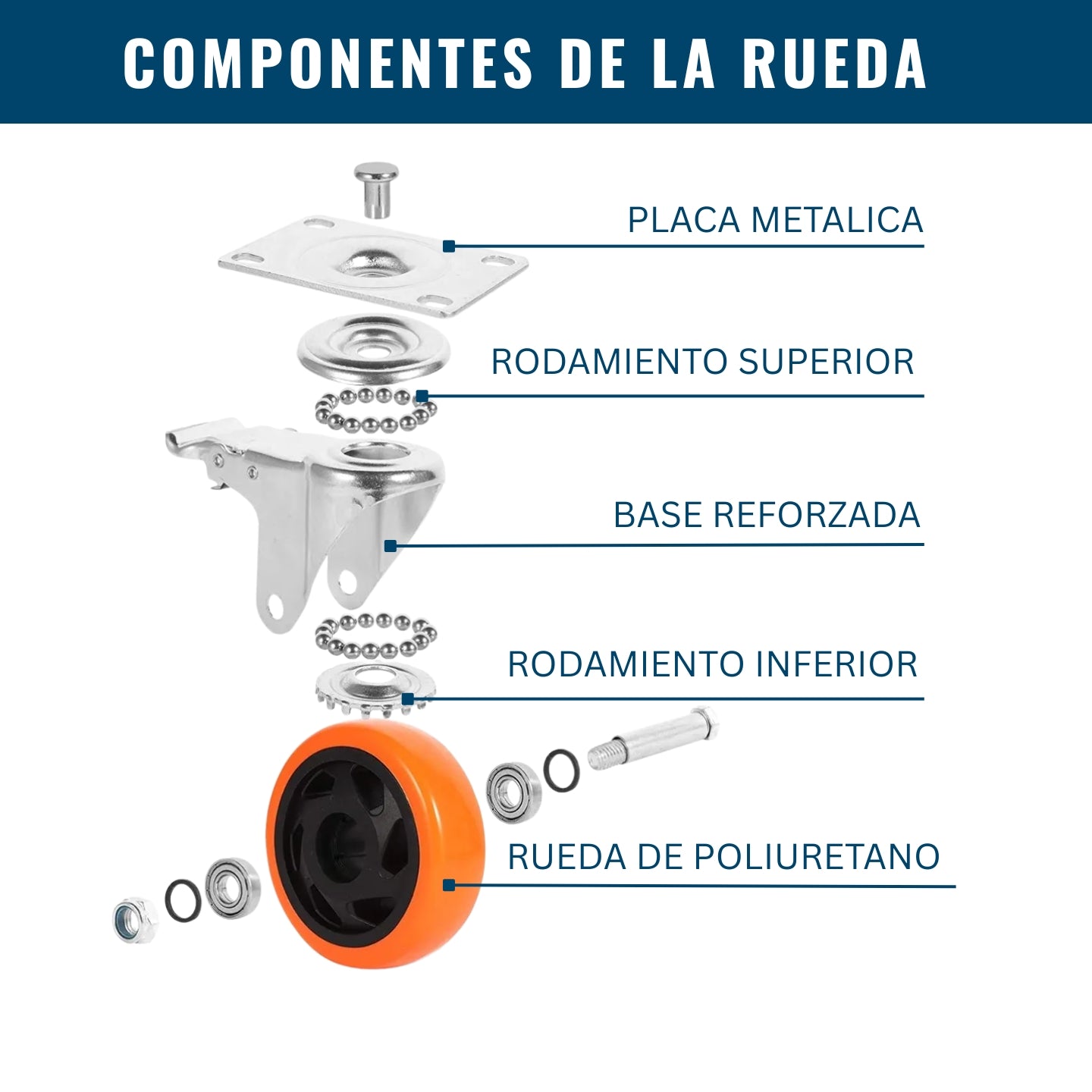 SIRVEN PARA FACILITAR EL MOVIMIENTO DE MUEBLES, ESTANTERÍAS, CARROS Y OTROS ELEMENTOS, OFRECIENDO DESPLAZAMIENTO SUAVE Y CONTROLADO GRACIAS A SU FRENO INCORPORADO